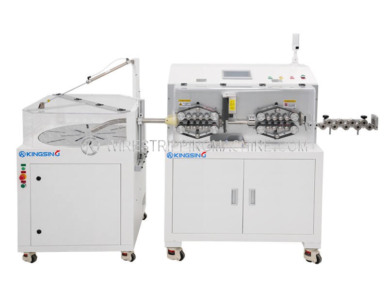 KS-W150R is a fully servo automatic cable stripping and coiling machine, the cutter, feeding roller, and coiling machine are all driven by servo motors, it integrates the functions of cutting, stripping and coiling, it is equipped with two bowl shaped coiling system on the left of the stripping machine, the processed cable can be coiled into a circle automatically, it is especially for processing the long cable, so that the finished cable can be collected and packed easily. The whole machine adopts fully servo motor control, the processing accuracy is high, the belt feeding system will not damage to the surfaceof the cable, suitable for customers with high requirements for quality.