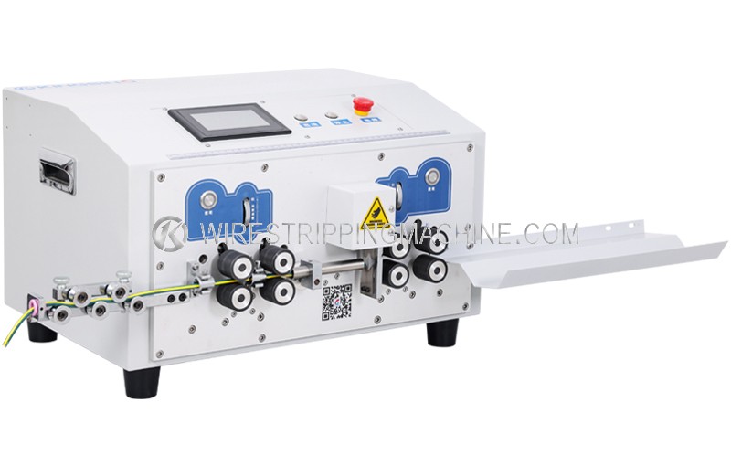 This is an 8-wheel drive wire stripping machine with left-side entry, which can cut and strip BVR multi-strand copper wires up to 25mm². It uses 8 wire feeding wheels to feed the material, which improves the stripping force and feeding accuracy, and prevents the wire from slipping between the wire feeding wheels during stripping.