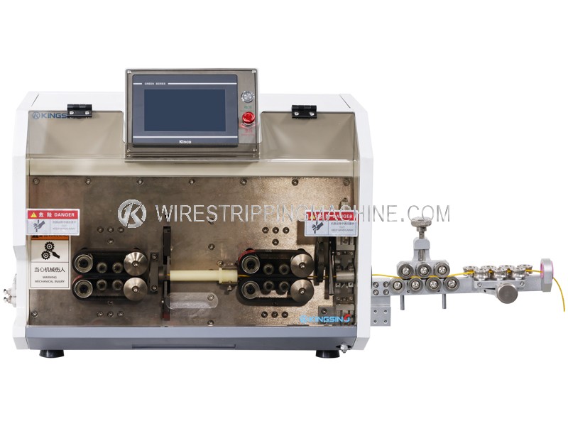 The upper and lower sets of wire feeding wheels are driven by positive and negative screw rods, which can be opened and closed at the same time. When processing wires of different thicknesses, the position of the center line of the wires can always be kept unchanged, and the wires are always aligned with the center of the blade opening, which can effectively prevent the stripping opening from tilting. The pressure of the wire feeding wheel can be set directly in the program, no need to manually adjust the screw, it is very convenient to switch between different wire diameters.