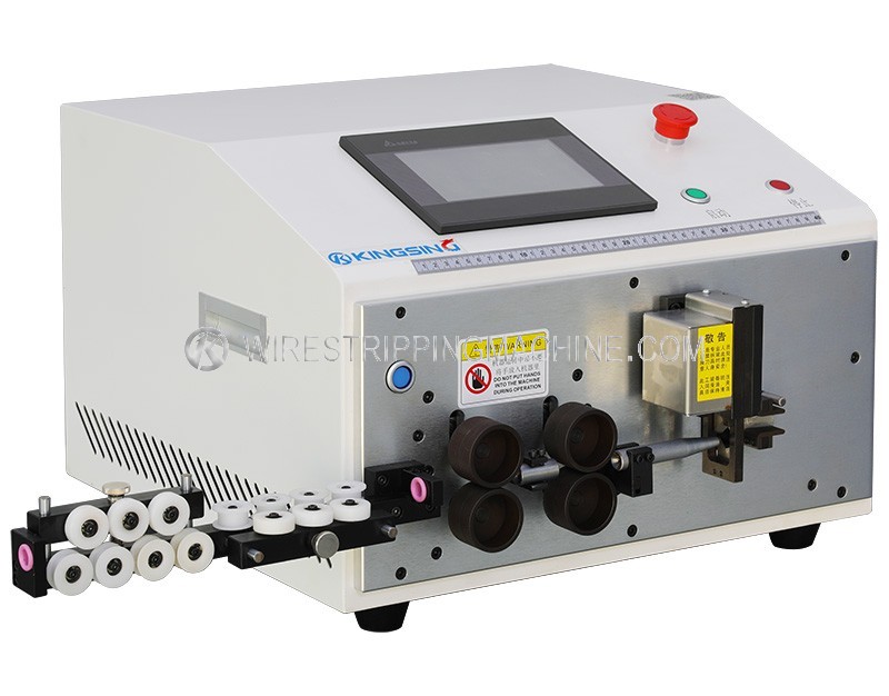 This is a fully automatic wire cutting, stripping and bending machine, which is specially designed for processing BV hard wires, and can process wires up to 16mm2. This machine uses 4 wire feeding wheels to feed the wire, which increases the contact area between the wire feeding wheel and the wire, which can prevent the wire from slipping between the wire feeding wheels and provide strong stripping power.