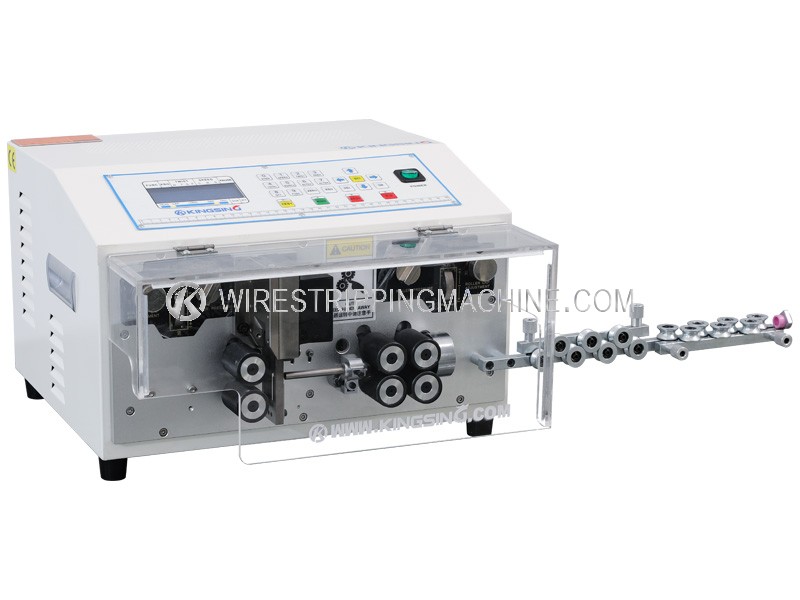 This is a six-wheel drive computerized wire stripping machine, which uses 4 wire feeding wheels to feed materials, which can effectively prevent the wires from slipping when stripping large wires and wires with tight sheaths, and improve feeding accuracy and stripping ability. It supports the function of automatically jumping the conduit. When the wire tail is stripped, the wire inlet conduit can be automatically lifted to avoid it, which greatly increases the stripping length range of the wire tail. Wire feeding wheel can choose rubber wheel or iron wheel, which is suitable for processing various BVR electronic wires, BV hard wires, sheathed wires, etc.